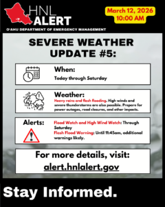 Additional updates will be issued as the situation develops or if t are significant changes to the weather forecast. Follow DEM on social media, encourage others to sign up for HNL Alert, and monitor local TV/radio. Help keep lines clear for first responders. Call 911 for emergencies only. Do not call 911 for general information updates.