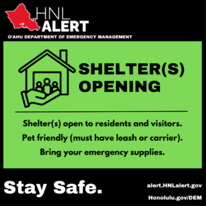 The City and County of Honolulu will open emergency shelters for impacted residents and visitors at 5:00pm today, Thursday, March 12 ahead of the anticipated most severe impacts from the Kona Low Storm. These shelters will be available throughout the storm for residents and visitors who need a safe place to go. The shelters are operated in partnership between the City and the Hawaii Red Cross and along with support from houseless outreach providers in coordination with Partners In Care.